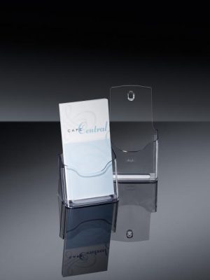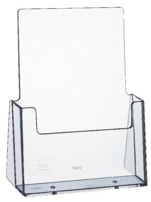 Stojan na prospekty formátu A5 s jedným oddielom. Materiál priehľadný číry plast. Rozmery: (š x v x h) 165 x 180 x 78 mm.