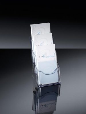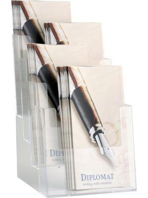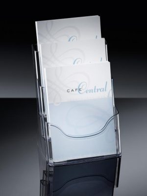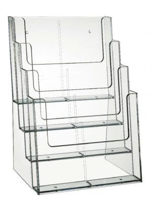 Stojan na prospekty formátu A5 so štyrmi oddielmi. Materiál priehľadný číry plast. Rozmery (š x v x h) 165 x 260 x 155 mm.