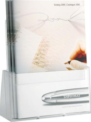 Stolný stojan s tromi odkladačmi unikátneho dizajnu z vysokokvalitného akrylu. Ideálny na brožúry, katalógy a letáky. Hĺbka odkladača 30 mm. 25-ročná záruka na odolnosť voči UV žiareniu. Rozmery 245 ...
