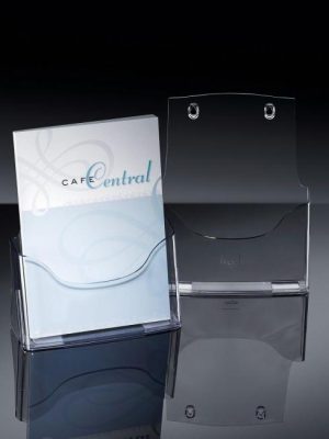 Univerzálny stojan odolný voči UV žiareniu v naklonenej verzii. Vhodný na výstavy, veľtrhy, ponukové listy, jedálne lístky a propagačné materiály. Vyrobený z kvalitného číreho akrylu, stabilný a pevný. Formát A5.