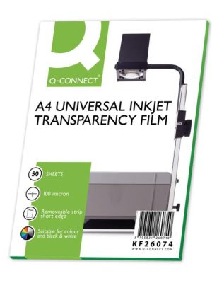 Priehľadné polyesterové fólie na spätnú projekciu. Formát A4. Fólie do čiernych a farebných atramentových tlačiarní Hewlett Packard s prúžkom po kratšej strane. Balenie 50 kusov.