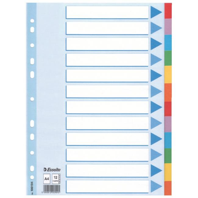 Celofarebný rozraďovač Esselte vyrobený z kartónu v rôznych farbách. Formát A4, eurodierovanie, popisovateľný titulný list na jasnú identifikáciu obsahu. Balenie jedna sada v polyesterovom sáčku. Väčšie balenie 10 sád.