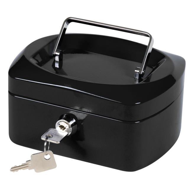 Uzamykateľná pokladnička s tvarovaným úchytom, plastovou priehradkou na mince a 2 kľúčami. Materiál pevná oceľ. Rozmery 155 × 75 × 120 mm. Farba čierna.